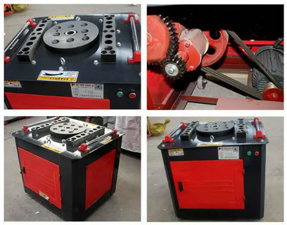 4.作业时,将钢筋需要弯的一头插在转盘固定备有的间隙内,另一端紧靠机身固定并用手压紧,检查机身固定,确实安在挡住钢筋的一侧方可开动。