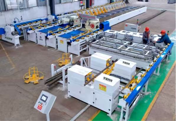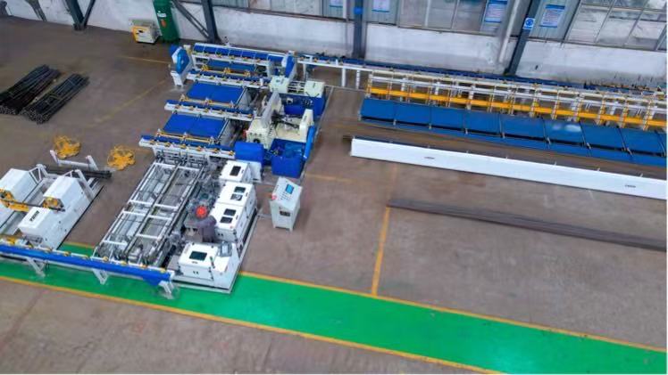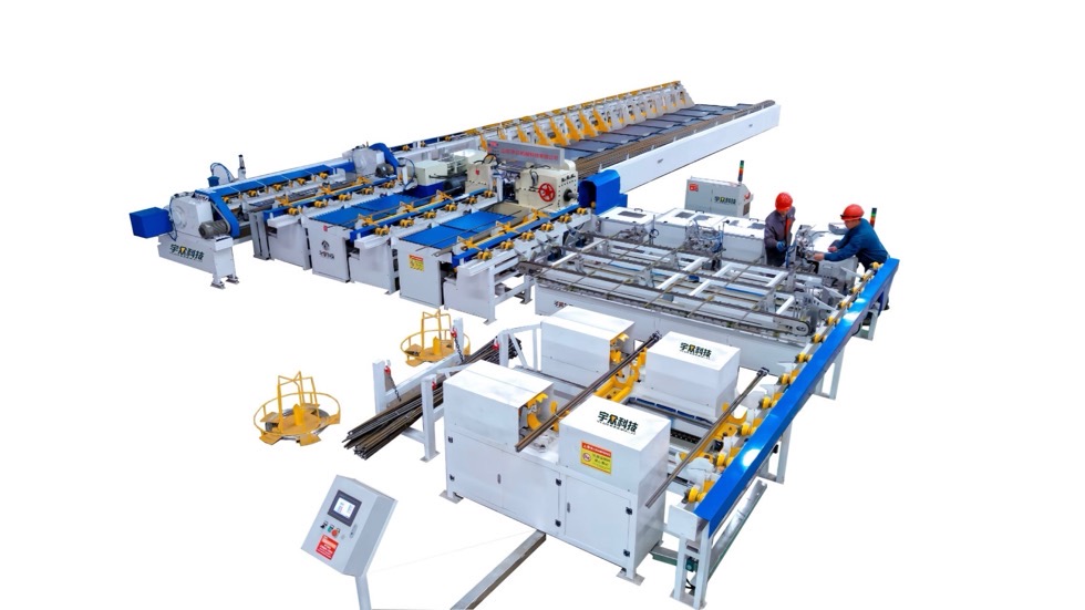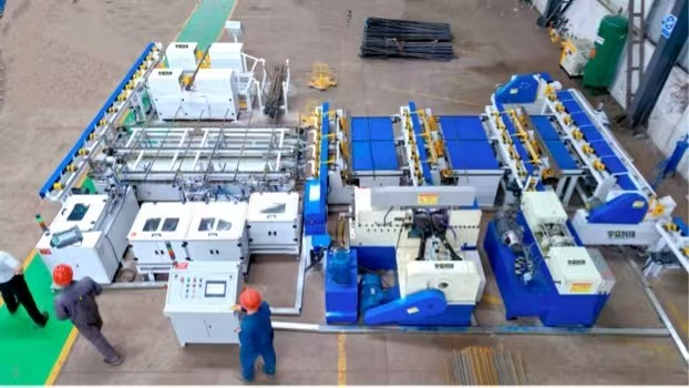 该生产线主要用于直径18-22mm,强度335Mpa/500Mpa/600Mpa的锚杆加工,主要包含定尺切断、45º斜角切断、缩径、滚丝、激光打标、穿球形垫、穿铁垫、穿尼龙垫、上螺母、成品打包工艺流程,由电气、液压、气动及自动化控制系统组合成型,可完成锚杆自动化流水线式加工生产,大大降低了用工数量和工人的劳动强度,提高了生产效率和产品质量。每班(8小时工作制)产能可达1200根锚杆。